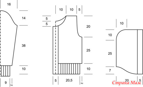 Левая полочка: на спицы № 4 итальянским набором смешанной пряжей набрать 40 п., вязать 10 см (= 26 р.) резинкой 2/2. Перейти на спицы № 8, равномерно убавив 10 п. (= 30 п.), вязать пряжей GALIA изнаночной гладью. Через 25 см (= 38 р.) от резинки выполнить пройму, как на спинке. Через 10 см (= 15 р.) от начала проймы для выреза горловины закрыть в каждом 2-м р. 3 х 2 п., 4 х 1 п. Через 20 см (= 30 р.) от начала проймы оставшиеся 13 п. закрыть.