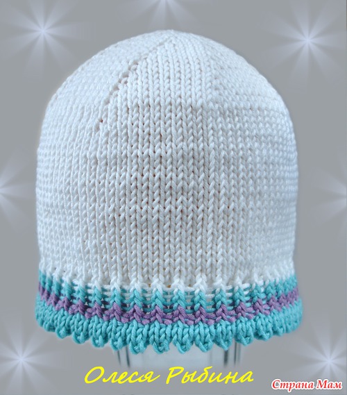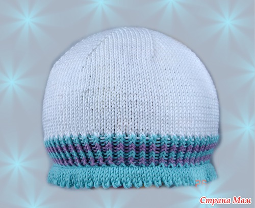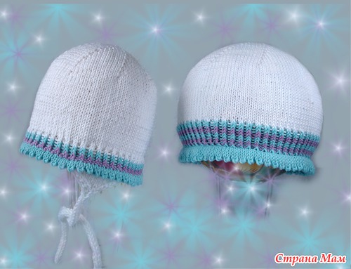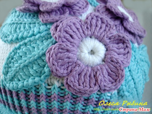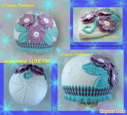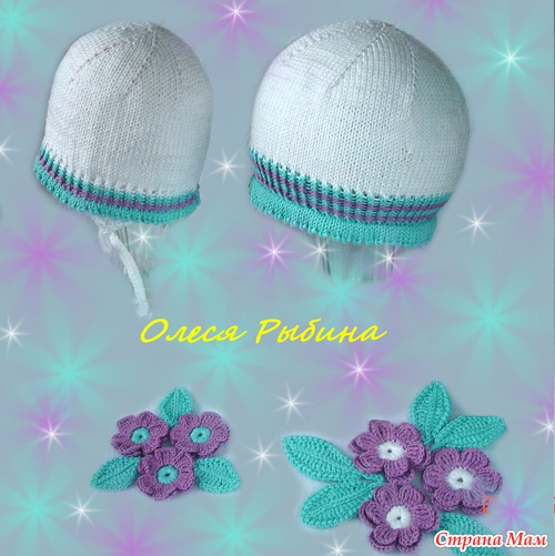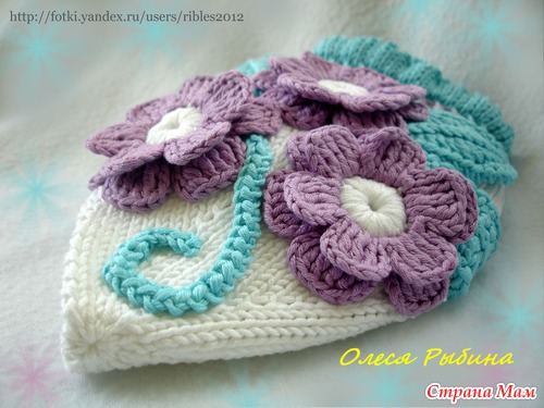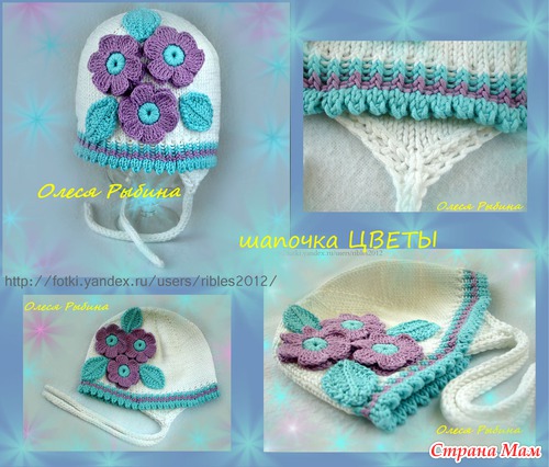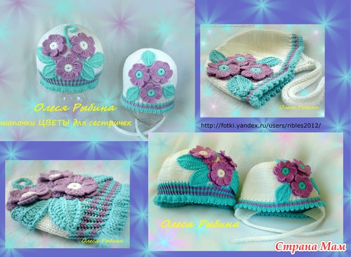 Спешу поделиться новыми шапками для маленьких сестренок 1,5 г и 3 мес. Дизайн шапки стар, как мир, но мне очень нравится. Использовала пряжу VITA cotton "CHARM" 50 г / 106 м 100% мерсеризованный хлопок, спицы № 2, на цветы-крючок № 1,3. цвета (4151 - Белый),(4181 - Светлый цикламен),(4185 - Светлая голубая бирюза). На маленькой шапке для цветов-пряжа Rose (Vita Cotton) 100% хлопок двойной мерсеризации. 50 г / 150 м, цвета (3909 - Светлая голубая бирюза),(3934 - Светлый цикламен). Ушло 2 мотка белой(с остатком)и немного цветных. Связано сверху вниз, резинка со скрещенной лицевой, по низу отделано зубчиками. Тут про вязание спицами от центра http://redicule.ru/uroki/vyazanie-po-krugu-spicami.-vyazanie-ot-centra.htmlПришито мононитью.
