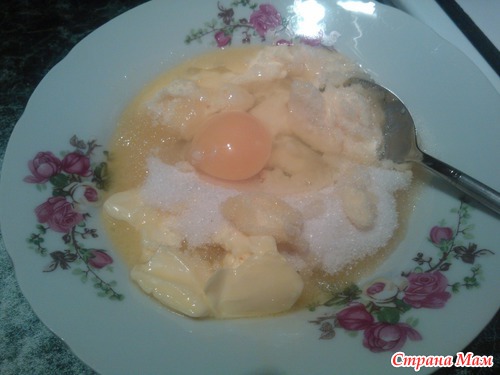 В миске растираем маргарин с сахаром, добавляем яйцо, сметану, соль и ванилин, засыпаем мучную смесь (можно всю сразу), тщательно перемешиваем.