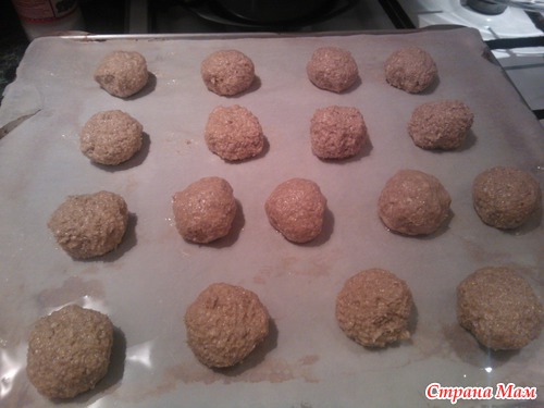 Противень покрываем бумагой для выпечки, смазываем маслом, из теста формируем шарики (размер в зависимости от того, большие или маленькие печенья хотите сделать, рекомендую около 4 см), выкладываем на противень. Между шариками надо оставить расстояние.