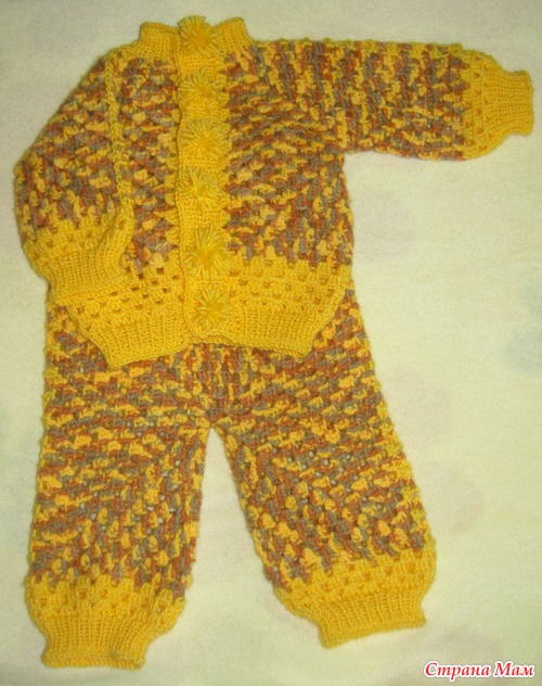 Описание кофточки: https://www.stranamam.ru/post/943126/, описание штанишек: https://www.stranamam.ru/post/3006289/Вот что получилось: