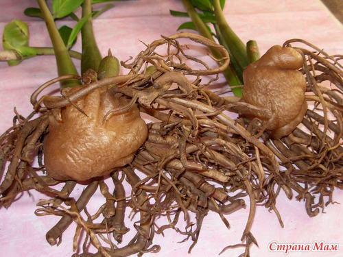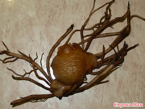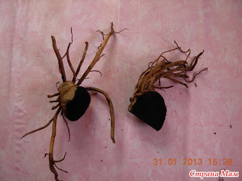 После мытья гниль я срезала и опять под напором воды всё промыла. Затем положила все корни в раствор марганцовки (минут на 5). После срезы обработала активир. углём