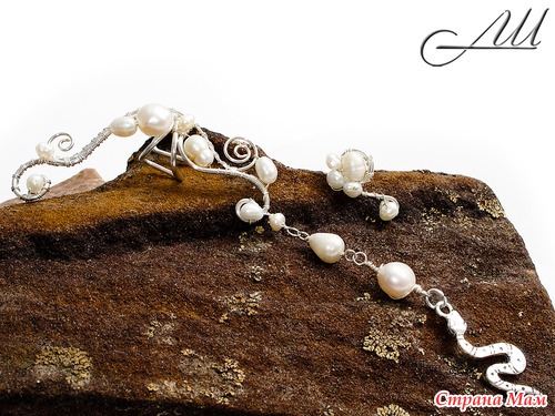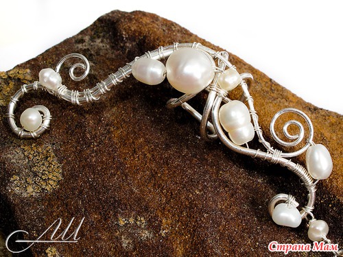 Кафф и сережка выполнены из посеребрёённой немецкой проволоки и речного жемчуга.
