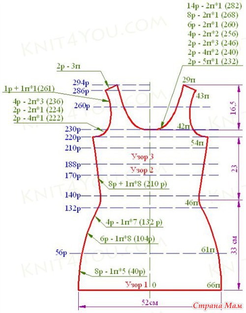 С 286 ряда выполнить скос плеча: во 2 ряду по 3 петли до 294 ряда.