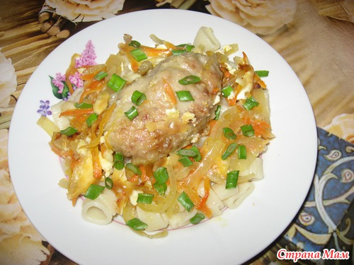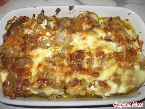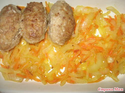 на этой же сковородке затем минуты 4 потушить под крышкой лук и морковь... В форму выложить половину овощей.. биточки..