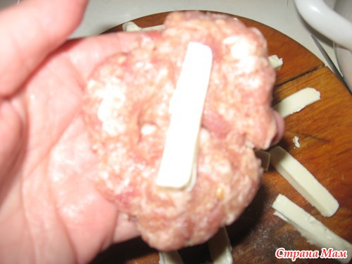 Из фарша делаем лепешку, на середину кладем сыр и сворачиваем..
