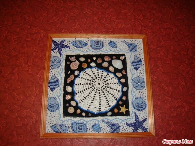 Так как рамка подобная не находилась долгое время, пылилась эта вышивка в шкафу. А тут перед походом за дочей в роддом перебирала свои недовязы и вспомнила про ракушек.