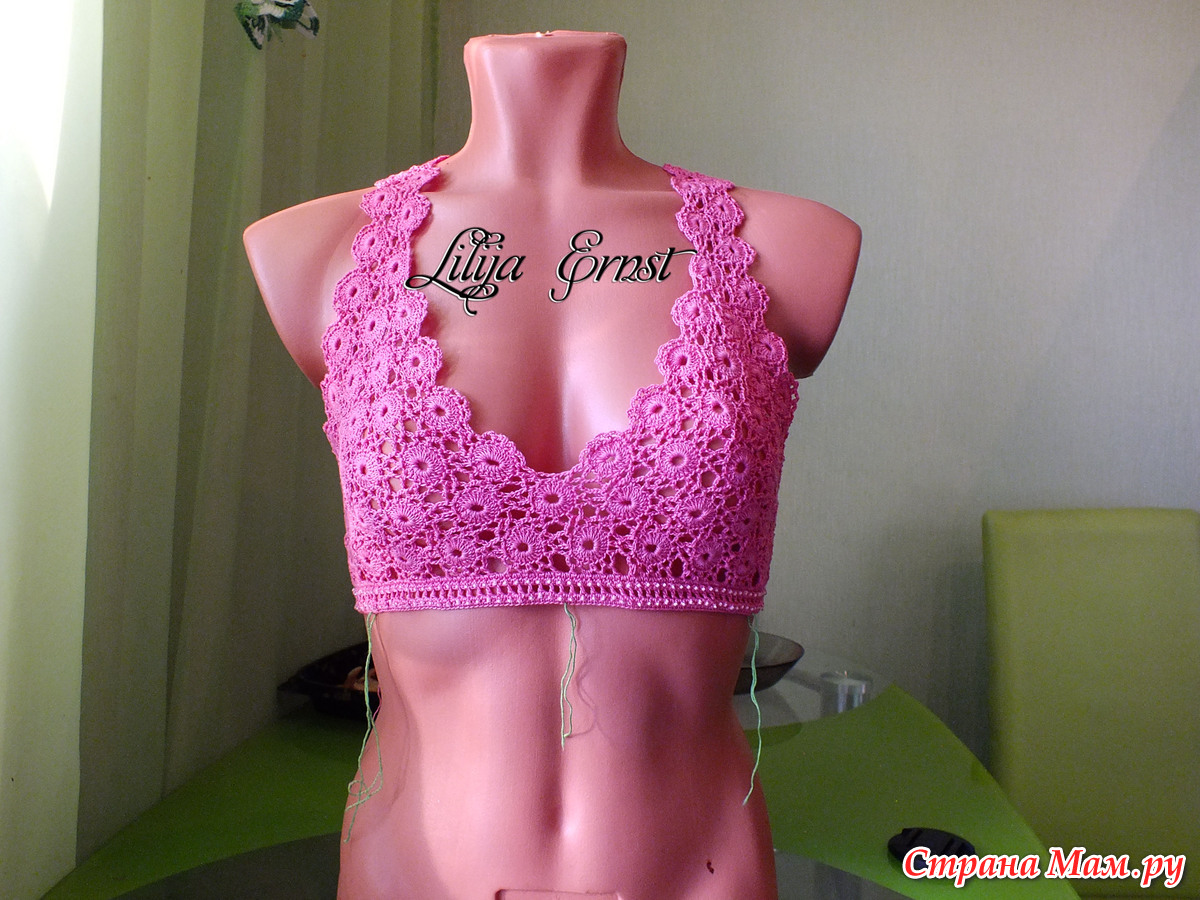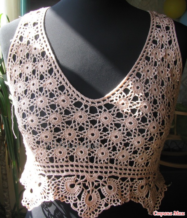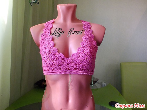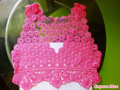 Сначала я связала полосу из трёх рядов кружочков, потом полностью спинку. Дальше закрыла нижнюю полоску. Продолжила вязание правой части лифа и после левой. Присоединила последние кружочки к спинке по схеме.