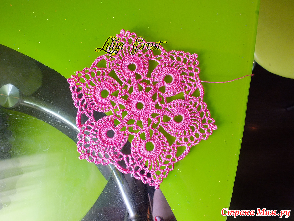 В оригинале другой узор на основе предыдущей схемы. В моём мотиве в центре колечко из 6 ВП обвязанное 24 С1Н. Арки по 6 ВП (на схеме 4ВП)