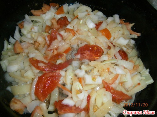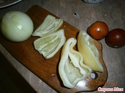 Перец болгарский, томаты, лук репчатый, чеснок, базилик, ушки кальмара, подсолнечное масло, соль, перец.
