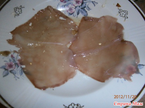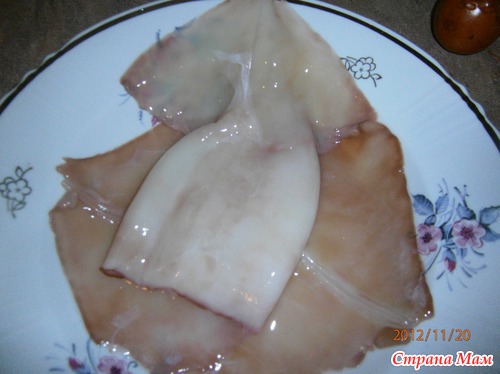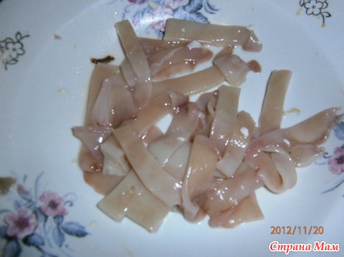 Пока тушатся овощи измельчаем ушки кальмара