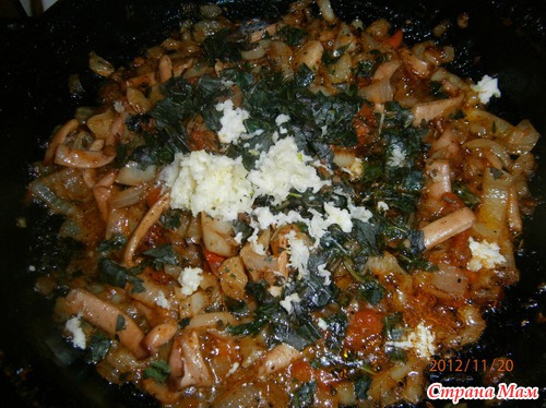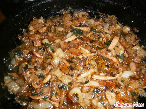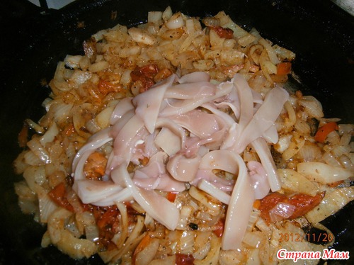 когда овощи готовы добавляем кальмары на сковороду, размешать