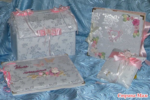 Добрый всем день! Девочки, в очередной раз прошу вашей помощи. Договорилась с одним свадебным салоном показать свои работы. Они мне выслали картинки того, что хотели бы видеть и вот мой результат. Для первого раза (сундук для денег, подушечка для колец и Книга пожеланий) вроде нормально. А как вам? И еще подскажите цену или как вы оцениваете мою работу. За ранее всем спасибо!!!