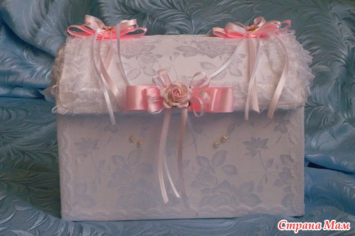 Сундук для денег: Материал креп-сатин, кружево 2х видов, полубусины, атласные ленты разных размеров и цвета, цветочки бумажные. Основа из гофрокартона.