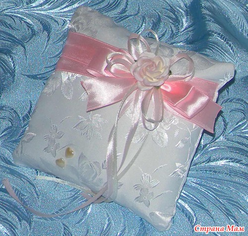 Подушечка для колец: Материал креп-сатин, ленты, цветочек, полубусины, наполнитель синтепон.
