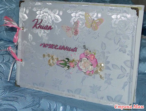 Книга пожеланий 31лист. Основа картон, мягкая обложка, надпись -чипборд, цветы, полубусины, уголки металлич.,