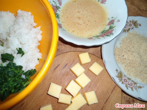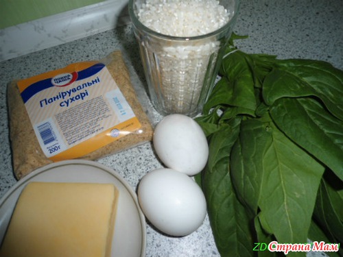 1 стакан круглого риса, грамм 100 шпината (пучок), 2 яйца, 100-150 г твердого сыра, 2-3 ст ложки панировочных сухарей,