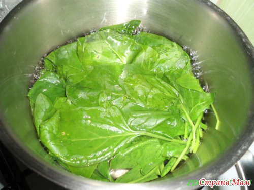 Рис предварительно отварить в подсоленной воде до готовности и остудить. Шпинат 2-3 минуты держать в кипятке,