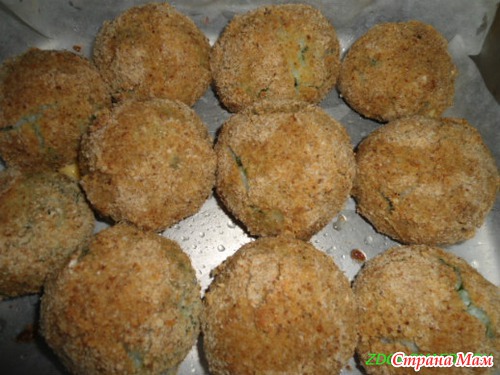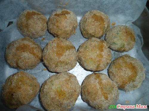 Каждый шарик обвалять в панировочных сухарях, затем в яйце и снова - в сухари. В форму для выпекания положить пергаментную бумагу, смазанную растительным маслом. Шарики уложить в форму, сверху взбрызнуть растительным маслом и поставить в разогретую духовку.
