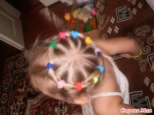 Делаю в сад дочке прически, каждый раз стараюсь разные. Практичная - это "веночек" или "солнышко", волосы по кругу в резиночки и ободочком вокруг макушки. (качество неочень, но смысл прически виден, это фото первой такой прически)
