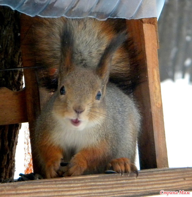 А там где в кормушке это я тихонько подкрадывалась и фотографировала, но всё равно если меня видела то сразу дёру на дерево высоко.