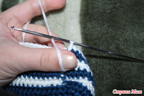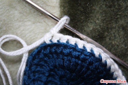 сделали подъем 1 в. п., провязали, начиная, с 2ой петли и в каждую 13 ст. б\н. в последнюю петлю 3 ст. б/н, 13 ст. б/н(пошла вторая половина круга), в последнюю петлю 3 ст. б/н. выходим на второй ряд.