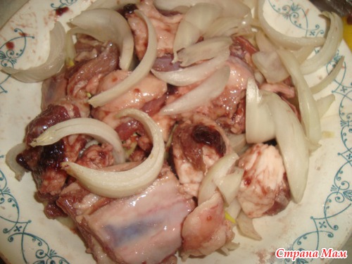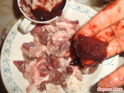 Мясо режим на куски по 50 г приблизительно солим, перчим, и приправим, у меня гранатовый соус. ну можно чем то заменить, толи нечего не делать.