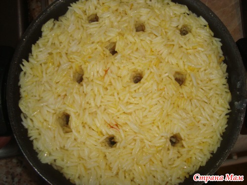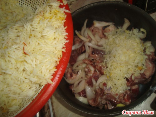 Кладем на мясо рис, слегка отваренный заране,