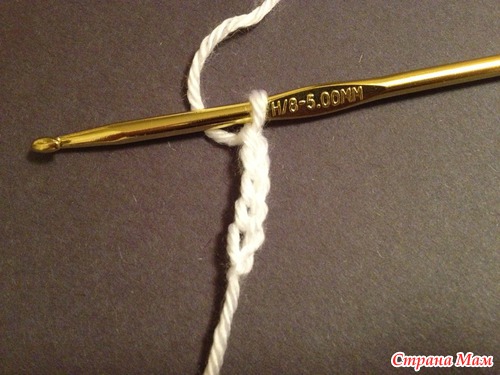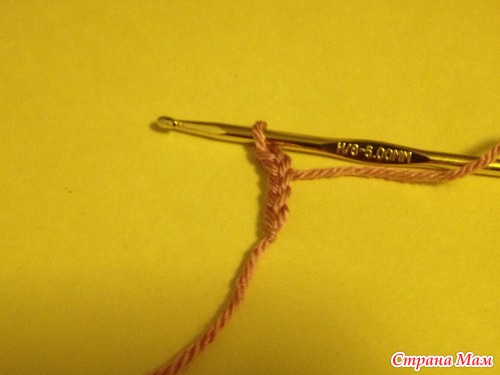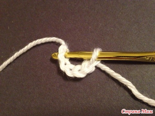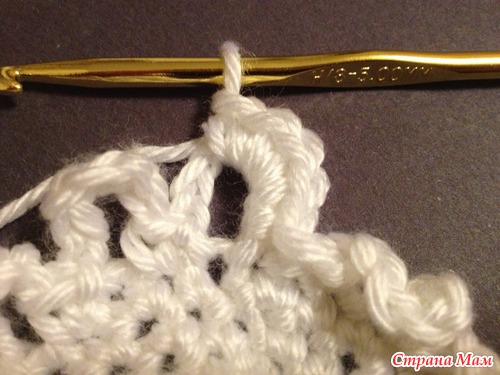 6. Вяжем 1 воздушн. петлю, 1 ст. без нак., под первую петлю, 2 ст. без нак. под вторую петлю и так до конца ряда.