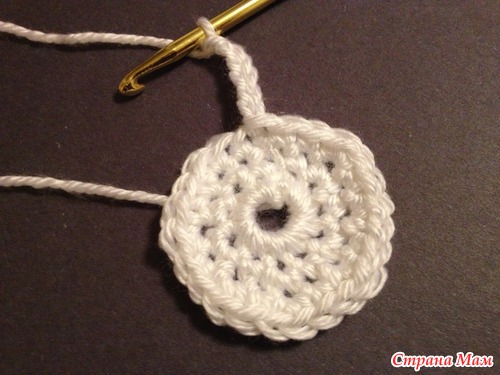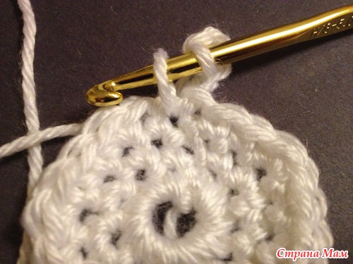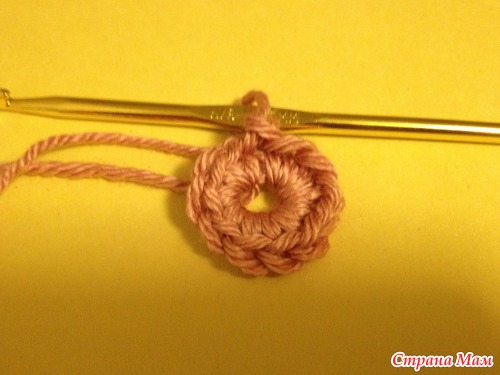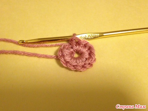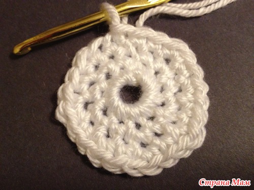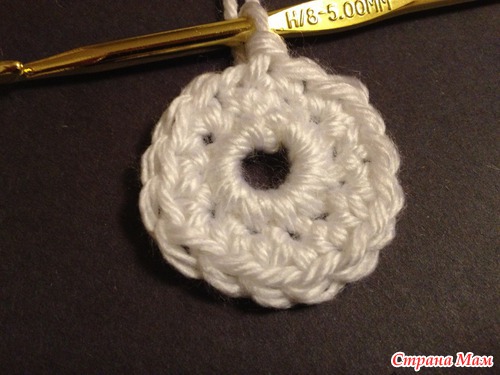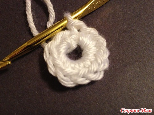 4. Вяжем 1 воздушную петлю для подъема следующего ряда. И обвязываем наш кружочек вокруг-11 столбиками без накида.