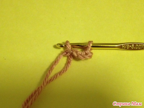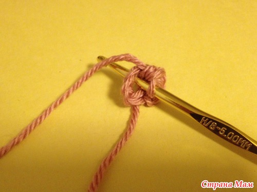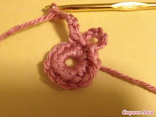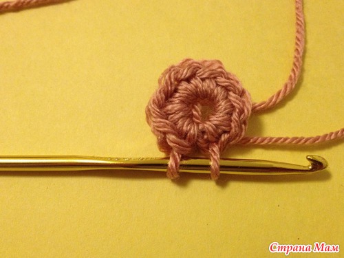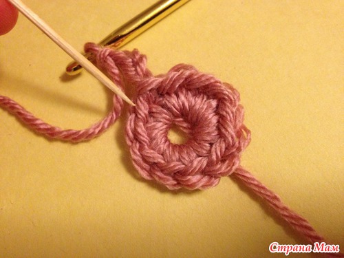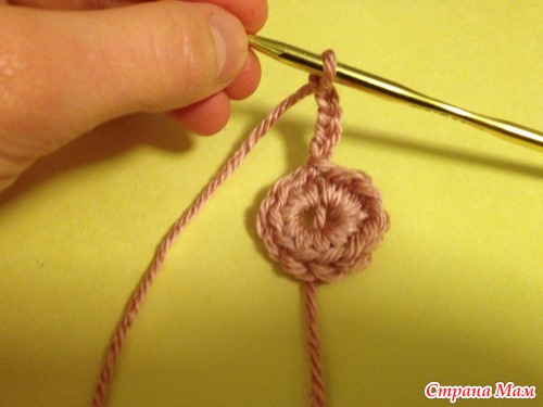 19. Но мы еще не закончили именно тот цветок который у меня просили. Итак такой же ниткой по цвету и качеству или можно по цвету взять другую, как ето сделаю я сейчас. Вяжем снова 5 воздужный петель и закрепляем их в круг.