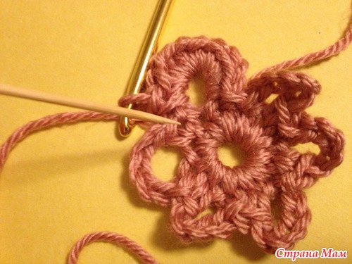 25. Обвязываем лепесток 10 ст. без нак. В промежуток между лепестками закрепляем лепесток соед. петлей.