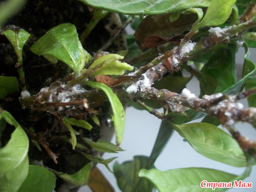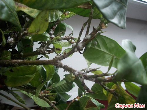 Вот такой плачевный вид у моей гардении. Все стебли покрыты липкой плотной паутиной, при раздавливании выделяется желтая, липкая жидкость. Листья желтеют. Рассмотрела на стебле под паутиной насекомое похожее на щитовку, только белое и не жесткое с множеством желтых лапок. Помогите, как спасти растение?