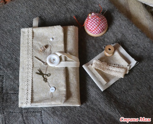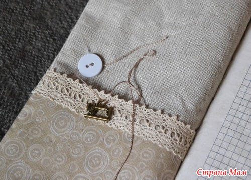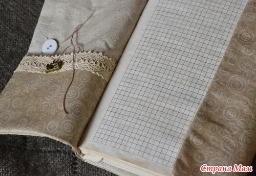 Обложка хлопок+лен, закрывается на пуговку. Украшения в рукодельном стиле, внутри небольшой кармашек и есть закладочка, которая крепится не сверху как обычно, а снизу.