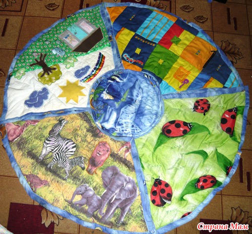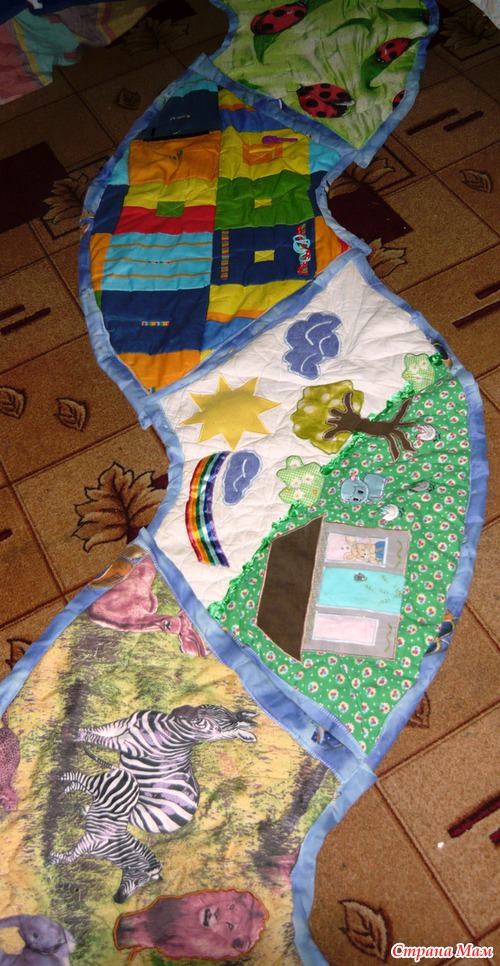 Привет девочки!!! Вот такой коврик-конструктор из остатков ткани я сшила для моей малышки. В диаметре 140 см. Состоит из пяти частей. Может быть просто круглым, а может раскладываться в дорожку.
