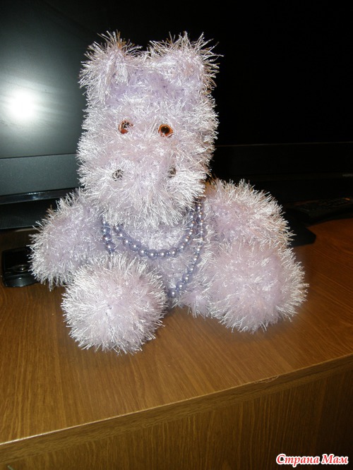 Это моя первая игрушка, пришлось докупить еще 1 моток ниток. Набивала синтепоном. Вышло не дорого!
