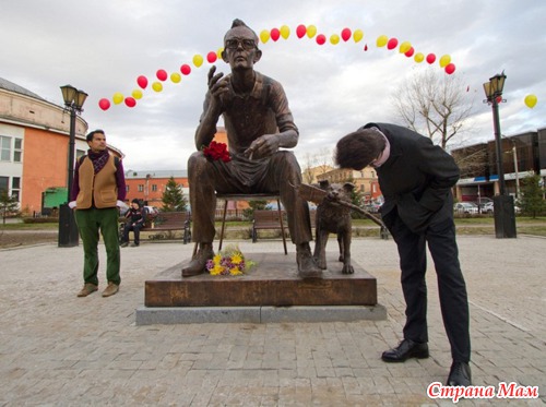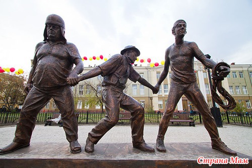 Памятник Гайдаю и героям его фильмов открыли в 2012 году в Иркутске, на площади возле цирка.