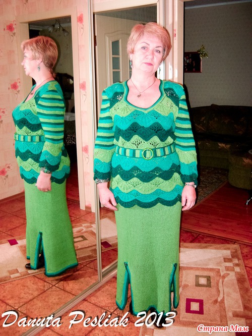 Насобирала мне дочь ниточек в зеленых тонах, и, переступая через некоторые сомнения по поводу гармонии этих цветов с собственной внешностью и комплекцией, я приступила к выбору узора и очертаний изделия. Вот что получилось, то и представляю на всеобщее обозрение. Хотелось бы узнать ваше мнение по поводу этого костюма.