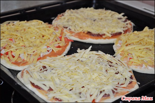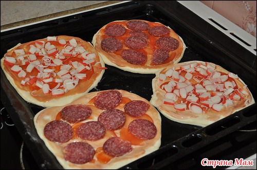 Выкладываем тонко нарезанный помидор. Далее на одни пиццы мы выкладываем колбаску, а на другие порезанные крабовые палочки.