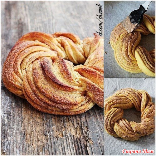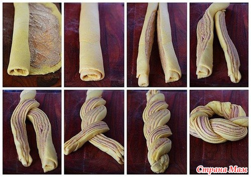4. Скрученный рулет разрежьте пополам вдоль, оставляя неразрезанным кончик. Переплетите 2 половинки и соедините концы, чтобы получился замкнутый круг.
