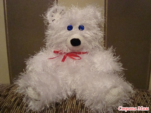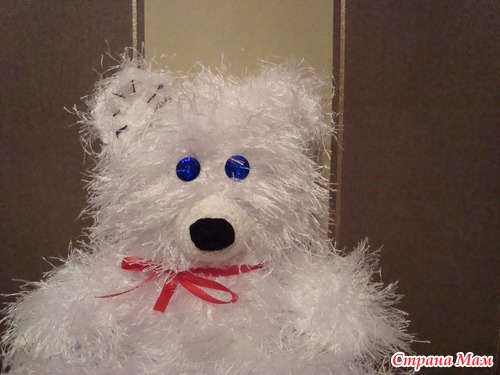 И мишаня Снежка в подарок любимой подруге на День Влюбленных. Связана на основе описания мишки от Галинки -Малинки, ниточки травка Ализе Fancy Decofur, спицы 4. Ниточки не понравились, лезут немного, зато пушистые.