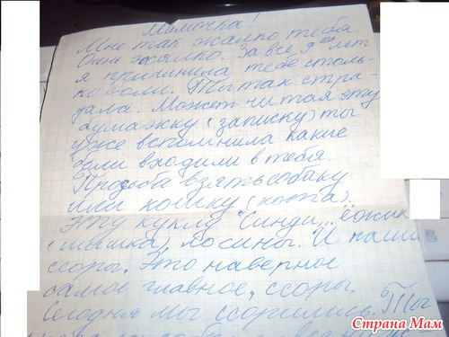 кстати, записки мы тоже оставляли друг другу, только не такие большие , обычно было " Трулялюшка -маме: поесть не успела, после тренировки обязательно! клянусь брюхом акулы" , или " мама-Эльке-труляленьке: " Собери вещи и книги в своей комнате, ходить невозможно "