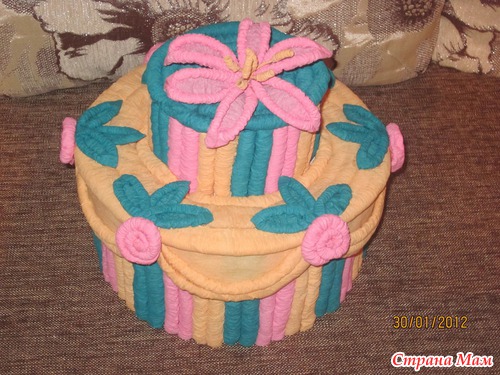 А все началось вот с этого торта. Увидела в "Стране мастеров" и влюбилась. Решила сделать. В итоге отдала в детский сад на какой-то конкурс.
