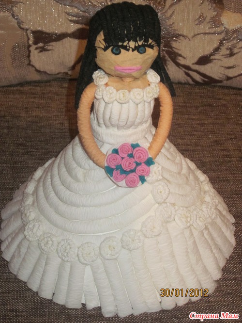 Понравилось мне работать с гофротрубочками, и сделала я вот такую невесту просто так (руки чесались), только почему-то без носа.