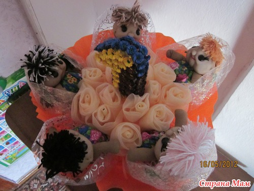 Захотелось мне племяшке на годик чего-то необычного сделать. Дурная голова рукам покоя не дает!!! И получился у меня вот такой букетик с самошитыми игрушками.