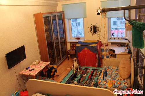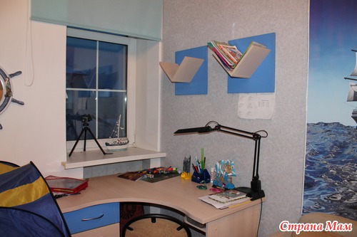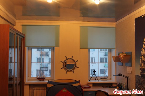 К сожалению все мечты не удалось реализовать. Изначально задумка была римские шторы с кораблями и в тон к ним покрывала, на кровати и диванчик. Но денег не хватило и пока обошлась рулонными шторами и примерно подходящими по цвету покрывальцами.
