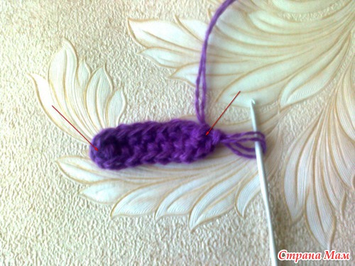По краям косички провязывать из одной петли - 3 петли (отмечено стрелками). Это нужно для расширения носовой части тапочка.