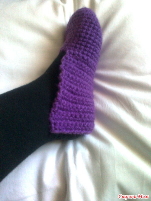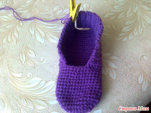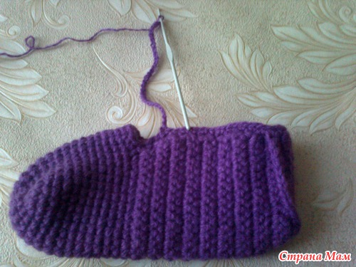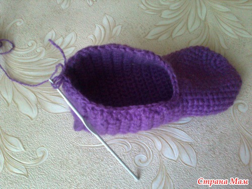Вот так. Этот разворот уходит на нижнюю часть тапка. Начинаем вязать боковые стороны и подошву.