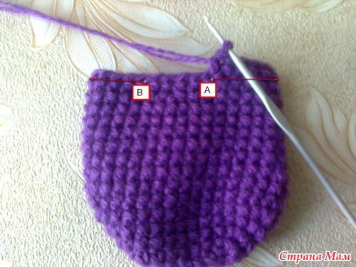 В конце первой части (точка А), заканчиваем вязание по прямой, делаем воздушную петлю.