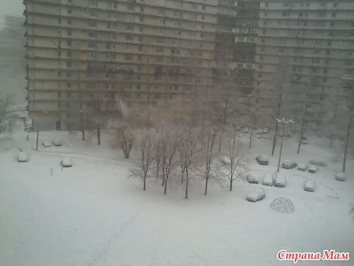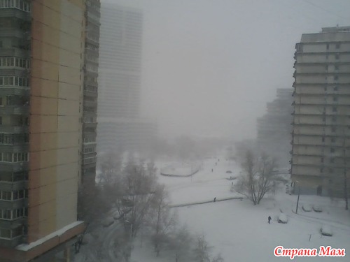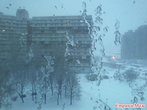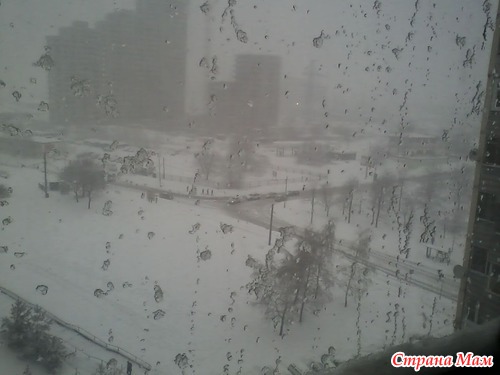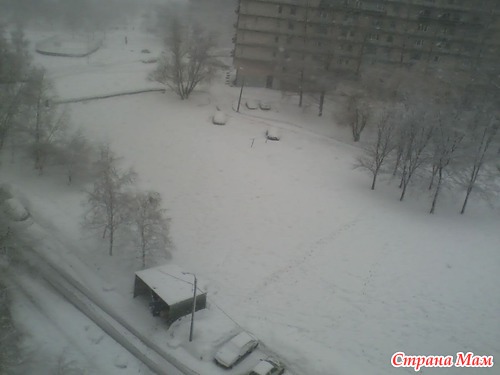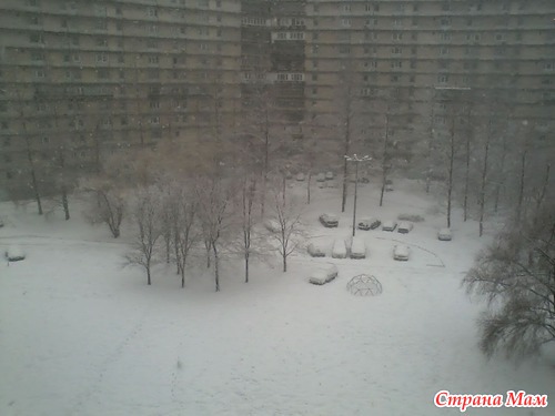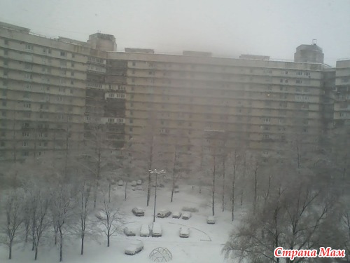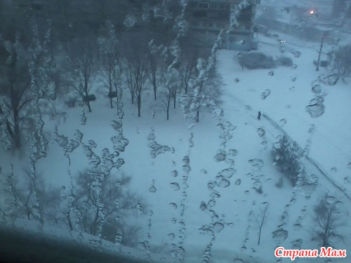 А вот мой видок из окна. Мая-то машинка за углом стоит, ей по прямой и в гору, вверх. Только не едет. Вот сосед копает. (Это ему надо буквой "Г", прямо, а потом направо и вверх.) Если раскапает у нашего да ту гору (там ещё 2 дома вверх), то тогда все сможем ехать. А я сегодня смогла только вокруг своей машины раскопать. 2 часа потратила, а на работу так и не смогла уехать.